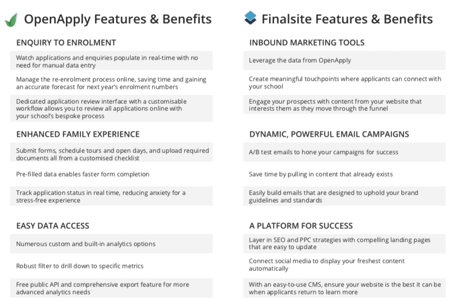 Marketing your school continues to be a large aspect of the admissions office’s scope. By utilising Finalsite and OpenApply together, your admissions office can leverage the core strengths of both systems to increase efficiency and productivity.