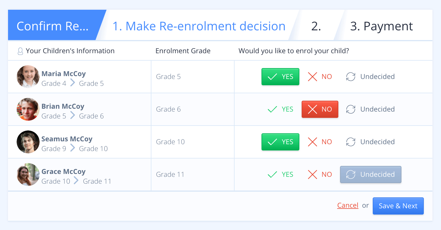 The mentioned changes will help improve the simple, streamlined process that OpenApply families have become familiar with. Parents can easily re-enrol for all children, even when making different decisions per child. Parents simply select the appropriate re-enrolment response for each child and proceed to fill the relevant form. The result is a stress-free process that will help families remain excited to return to your school next year.